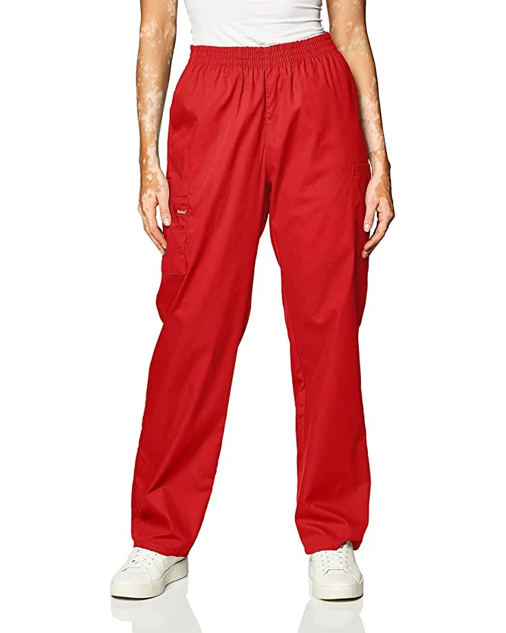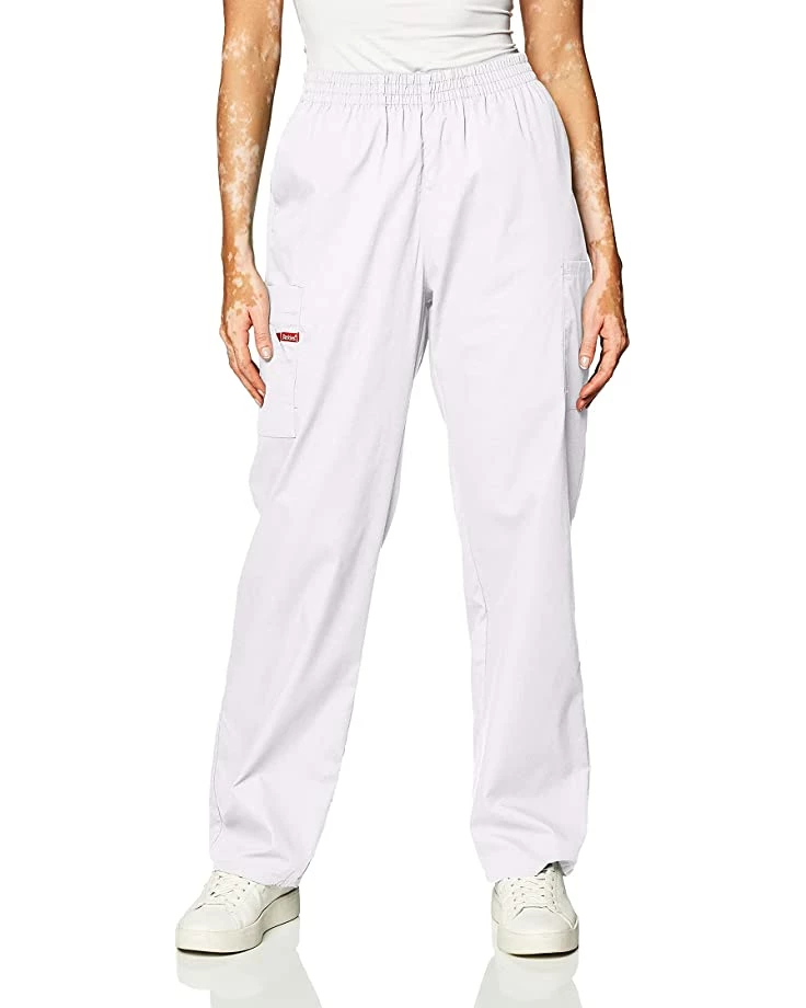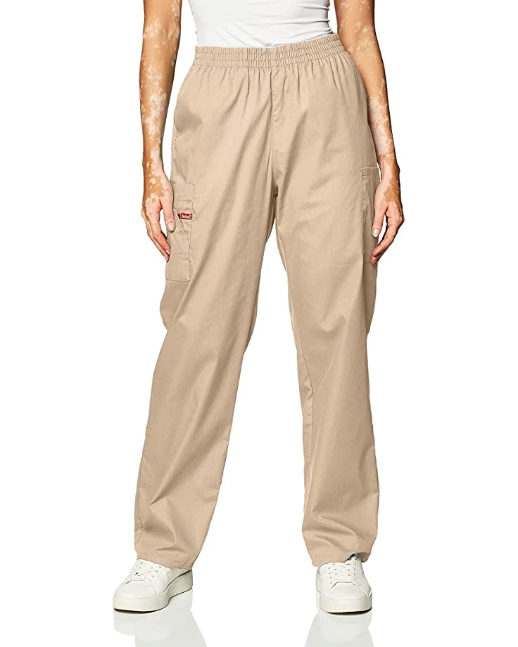 - A missy fit, natural rise, tapered leg, pull-on pant features an all-around elastic waistband with Dickies logo twill tape on the inside back waistband and as an instrument loop on the right cargo pocket. Also featured are slash pockets and cargo pockets with a stretchy red knit interior pocket (white knit pocket on white).